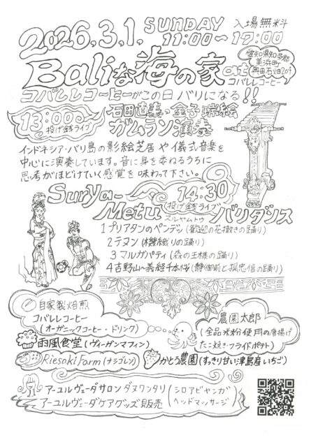 Baliな海の家 | POSTED ON : 2026-02-28 Baliな海の家 2026-3-1(日)@コバレレコーヒー 知多郡美浜町奥田石畑204 投げ銭Live Gender Wayang ガムラン演奏 13:00 Surya-Metu バリ舞踊 14:30 < PREV